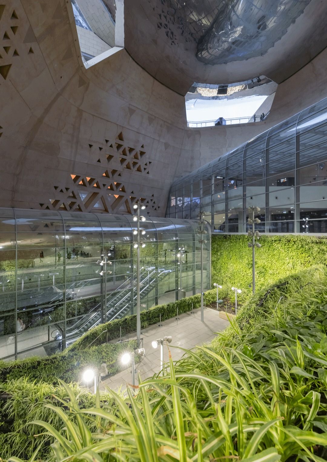 在中庭底部,一个可进入的微气候花园铺陈开来。乘客可在此稍作停留,于绿荫中等待下一班列车。花园位于地下约 35米,即便在盛夏仍能保持舒适的温度,而灌溉用水来自广场与天篷上收集的雨水。