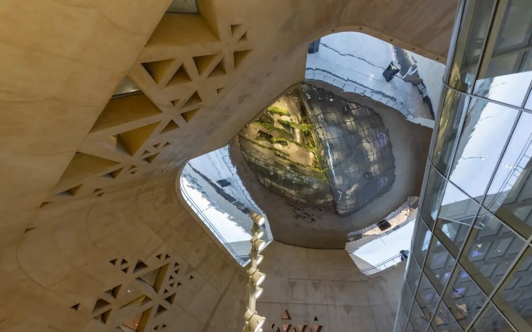 支撑天篷的是轻盈而强壮的空间钢结构,通过可调节拉杆将结构与不锈钢外皮连接,使天篷如云一般从其底部的巨大锥形墙体上方飞扬延展。地下部分的倾斜墙面采用渲染式表面处理,灵感来自当地传统建筑语言。