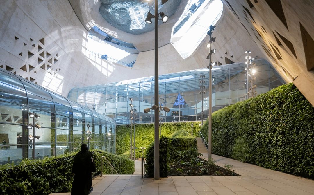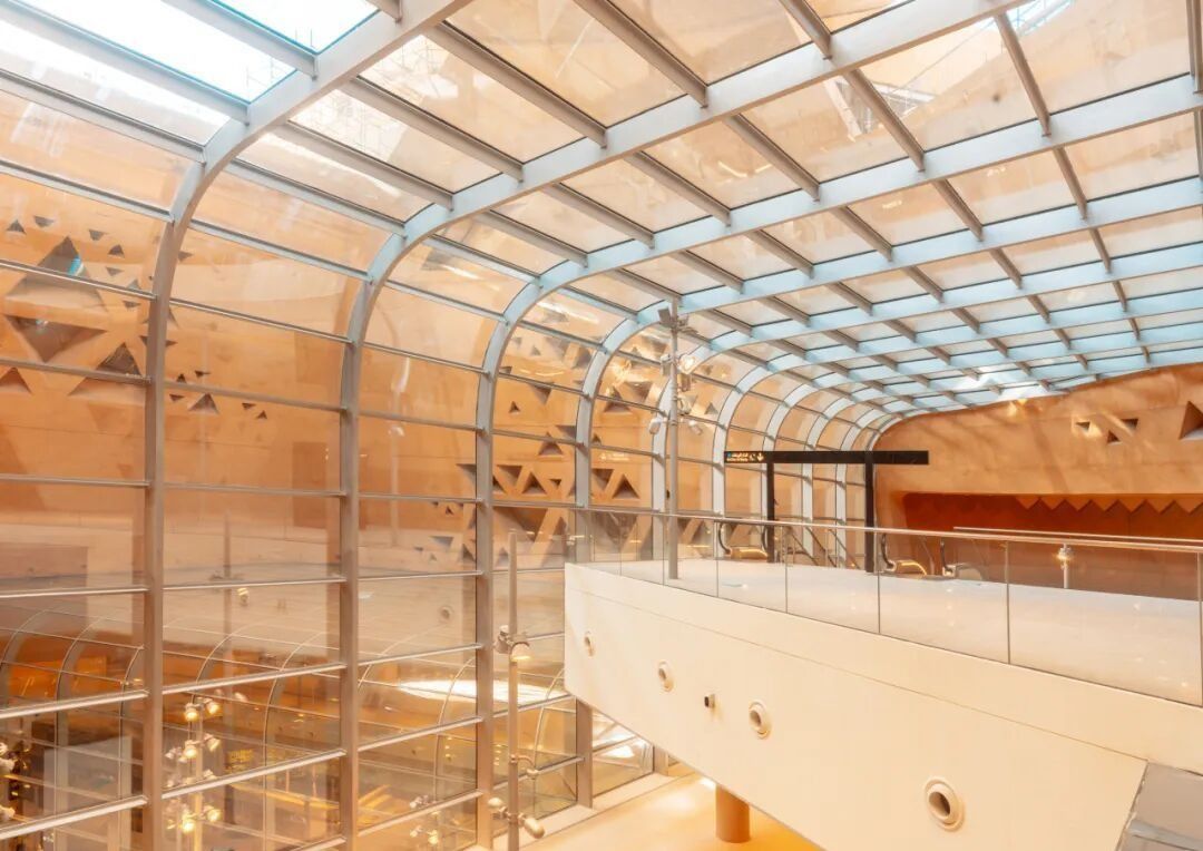 站台位于中庭的大型玻璃管廊中,内外之间的界限随之更加通透,而候车空间也能共享中庭的尺度与光线,带来壮阔的空间体验。对于仅从列车中穿行而过的乘客而言,这一景观也象征着利雅得历史城区的重要性,以及城市过去与未来的衔接。
