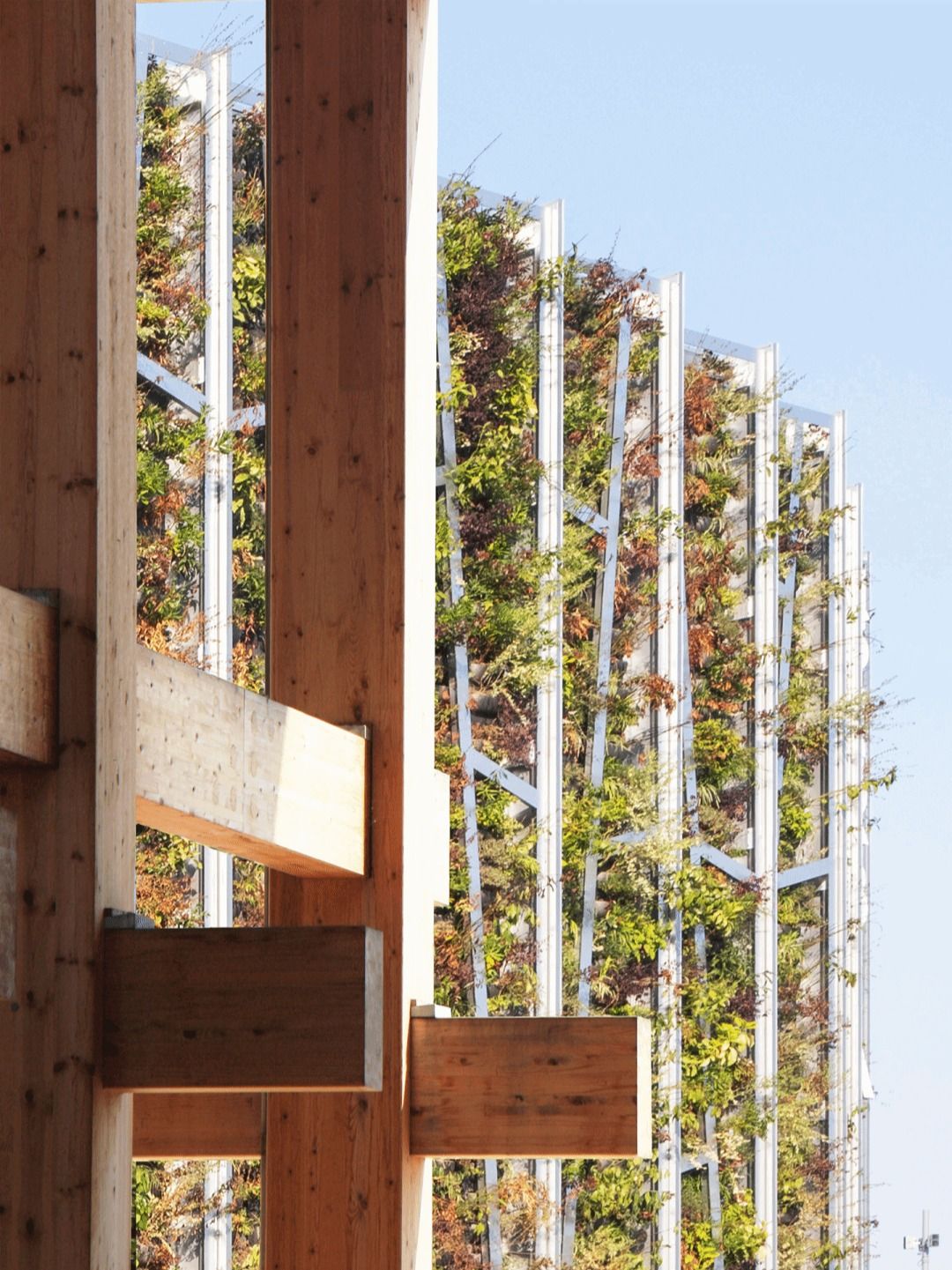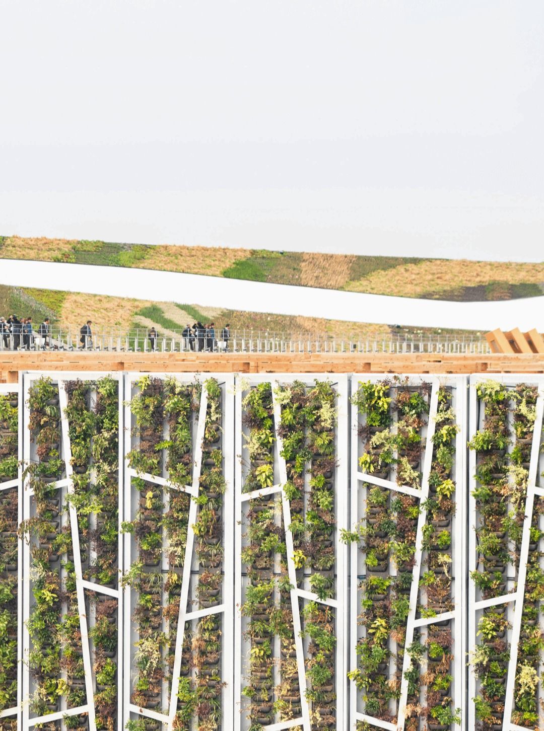 在被大屋根木结构所形成的重复节奏所环绕的环境中,展馆选择通过“回应”而非“对抗”来建立关系。设计在立面上提炼并抽象化呼应环形结构语言的若干元素,形成两种建筑之间的视觉对话。建筑既映射周边环境,也为访客营造出层次丰富的体验——通过图案、肌理与形态的变化,将注意力引向展馆本身与更广阔的世博环境。